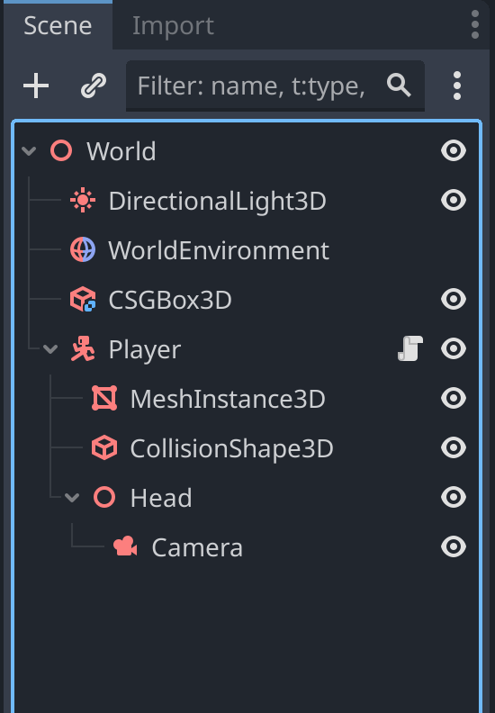 The example above is a screenshot from the Godot engine of a new 3D video game I am building. In Object-Oriented Programming, you commonly start with a “root” node or class. This acts as a base for the rest of the code which inherits data and instructions.